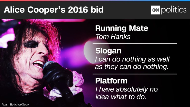 15 июля 2016 года Элис Купер официально объявил о выдвижении своей кандидатуры на пост президента США.